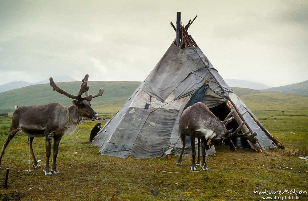 Lager einer Tsaatan-Familie mit Zelt und Rentieren (Rangifer tarandus) Chowsg?l Nuur, Mongolei