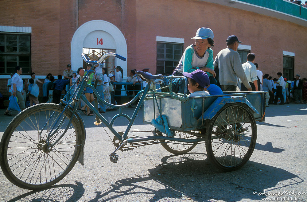 Lastenfahrrad vor dem Stadion von Ulaanbaatar Ulaanbaatar - Ulan Bator, Mongolei