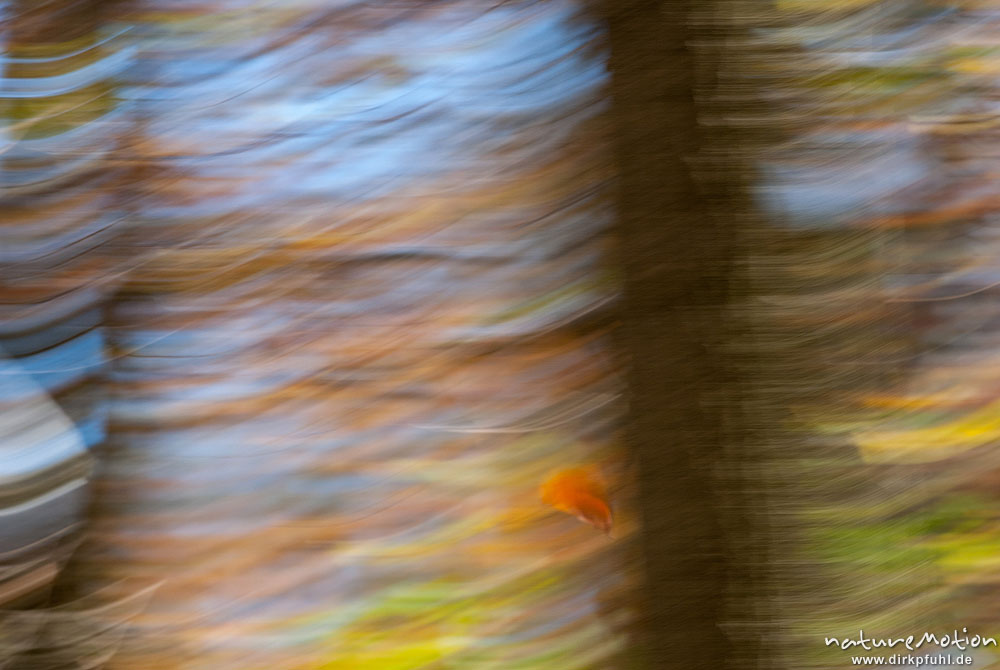 Laubfall, mitgezogen, abstrakte Muster, Herbstwald mit dünner Schneedecke, Rot-Buchen, Eichen und Kastanien, Laubfärbung, Nationalpark Hainich, Craula, Deutschland