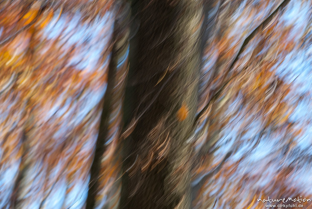 Laubfall, mitgezogen, abstrakte Muster, Herbstwald mit dünner Schneedecke, Rot-Buchen, Eichen und Kastanien, Laubfärbung, Nationalpark Hainich, Craula, Deutschland