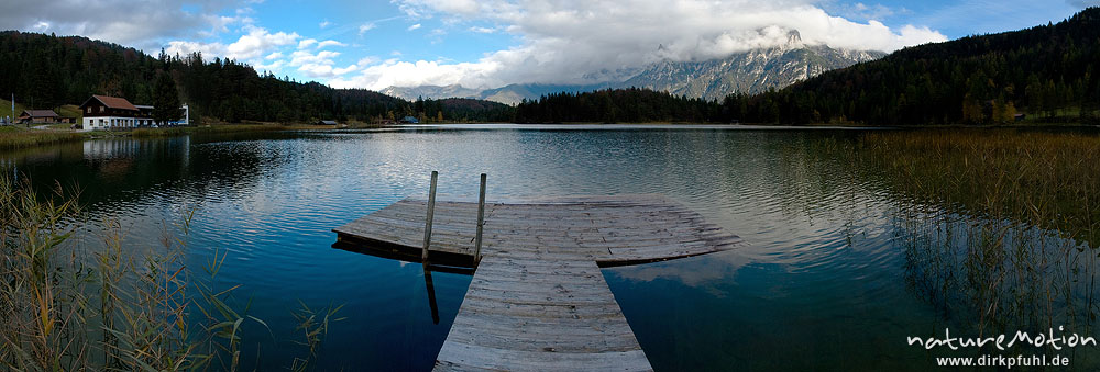 Lautersee und Karwendel, Badesteg Mittenwald Oberbayern, Deutschland