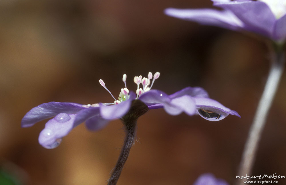 Leberblümchen, Hepatica nobilis, Blüte von der Seite und mit Regentropfen, Göttinger Wald, Göttingen, Deutschland