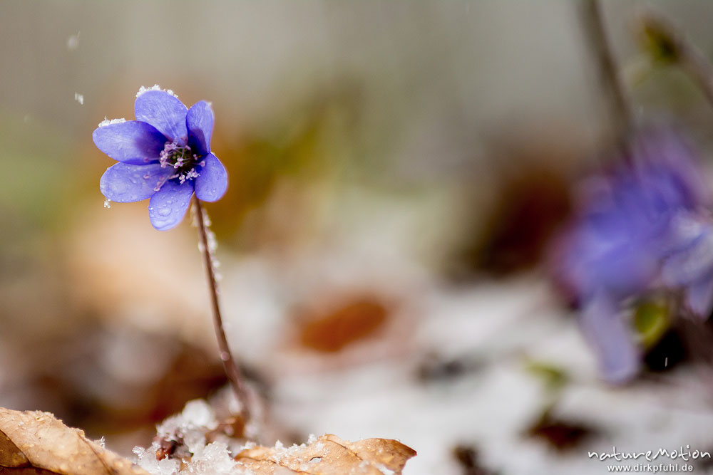 Leberblümchen, Hepatica nobilis, Ranunculaceae, Blüte bei Schneeregen, Göttinger Wald, Göttingen, Deutschland