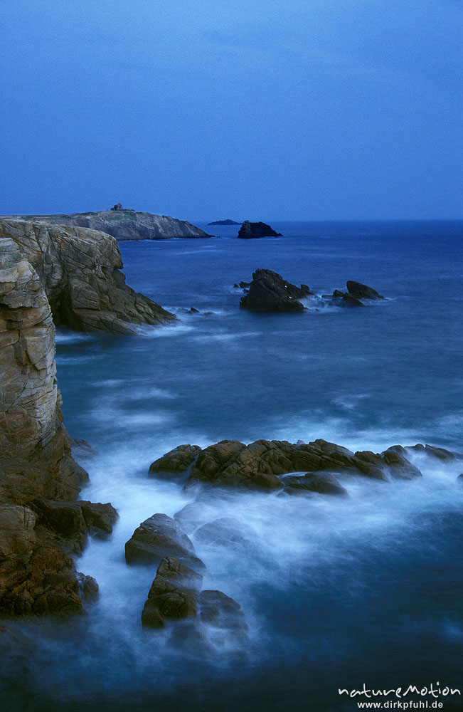 leichte Brandung an Felsküste, Abendlicht, lang belichtet, Bretagne, Frankreich