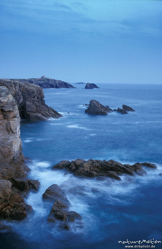 leichte Brandung an Felsküste, Abendlicht, lang belichtet, Bretagne, Frankreich