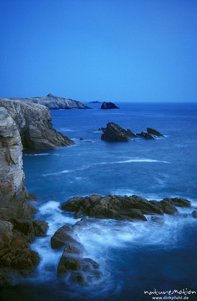 leichte Brandung an Felsküste, Abendlicht, lang belichtet, Bretagne, Frankreich