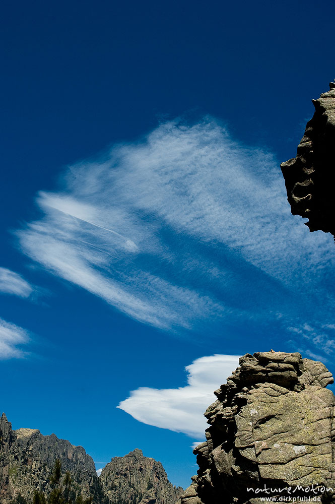 Lenticulariswolke und Cirrocumuluswolken, Gebirgslandschaft, Blick von der Bavella Richtung Nord-Ost, Korsika, Frankreich