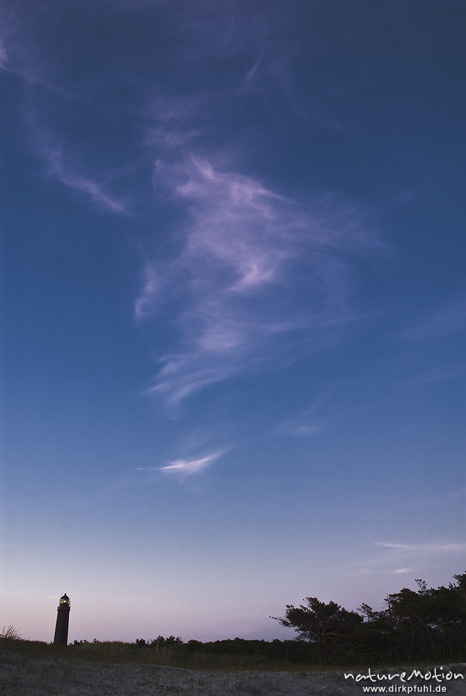 Leuchtturm Darsser Ort inmitten von Dünenlandschaft, Wolken, Abendlicht, Darß, Zingst, Deutschland