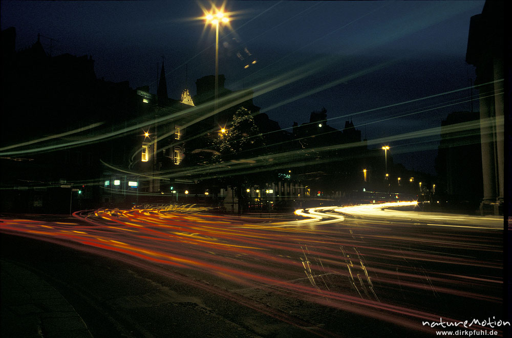 Lichter vorbeifahrender Autos, Straßenbeleuchtung, College Street, Dublin, Langzeitaufnahme, Dublin, Irland