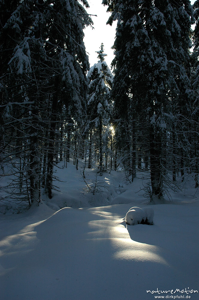 Lichtfleck im Fichtenwald, verschneit, Oderteich Harz, Deutschland