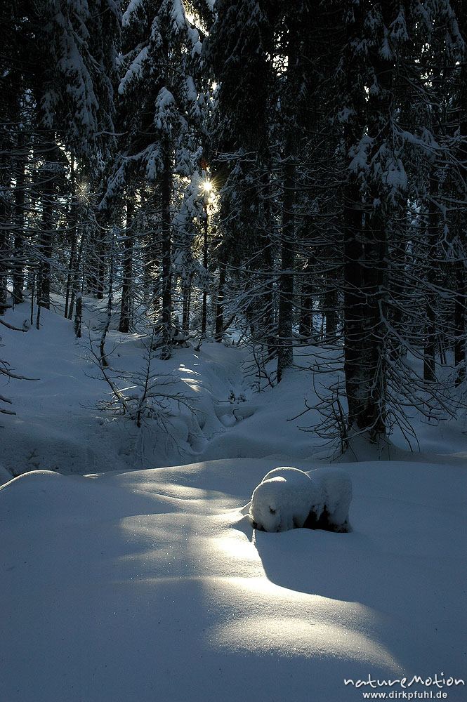 Lichtfleck im Fichtenwald, verschneit, Oderteich Harz, Deutschland