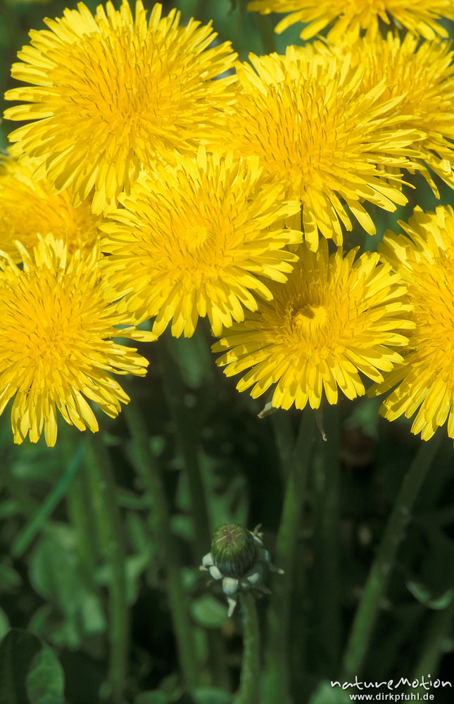 Löwenzahn, Taraxacum officinale, Asteraceae, blühend, mit Stengeln in Seitenansicht, Kirschplantagen bei Witzenhausen, Witzenhausen, Deutschland