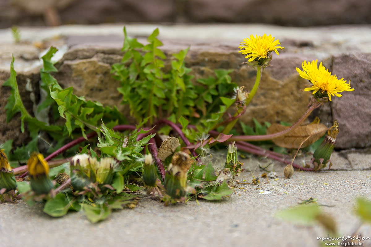 Löwenzahn, Taraxacum officinale, Asteraceae, blühende Pflanze an einer Steintreppe, Freibad Weende, Göttingen, Deutschland
