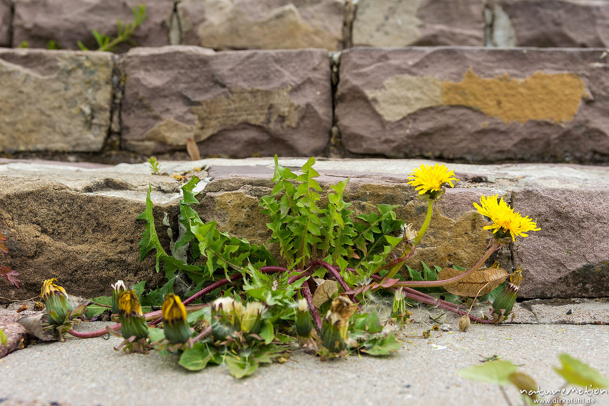 Löwenzahn, Taraxacum officinale, Asteraceae, blühende Pflanze an einer Steintreppe, Freibad Weende, Göttingen, Deutschland