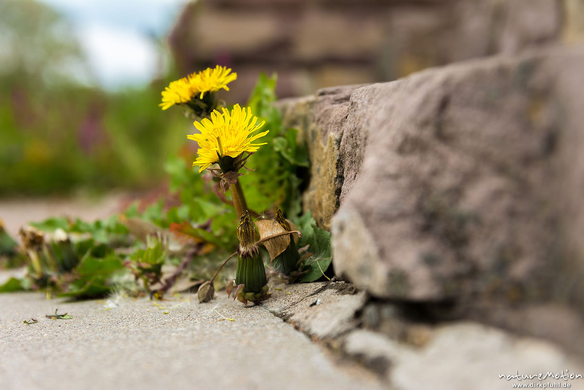 Löwenzahn, Taraxacum officinale, Asteraceae, blühende Pflanze an einer Steintreppe, Freibad Weende, Göttingen, Deutschland