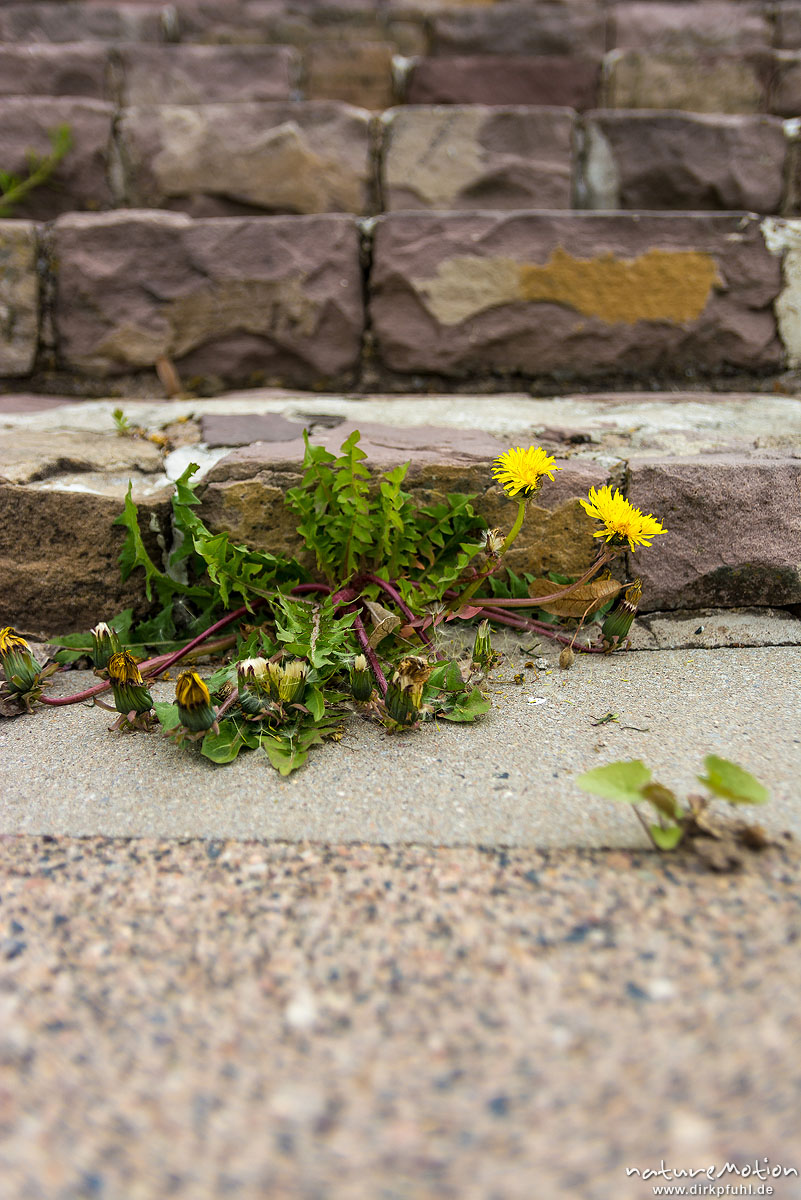 Löwenzahn, Taraxacum officinale, Asteraceae, blühende Pflanze an einer Steintreppe, Freibad Weende, Göttingen, Deutschland