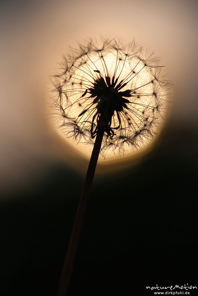 Löwenzahn, Taraxacum officinale, Asteraceae, Fruchtstand im Gegenlicht der Abendsonne, Kerstlingeröder Feld, Göttingen, Deutschland