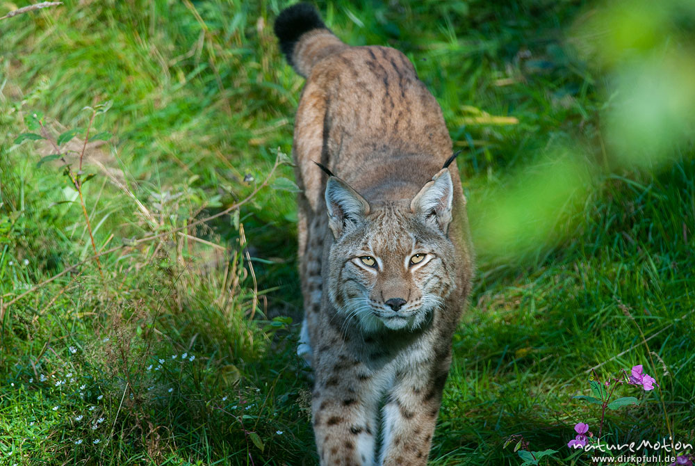 Luchs, Lynx lynx, Felidae, Alttier auf Schleichpfad, Tierpark Neuhaus, captive, Neuhaus, Deutschland
