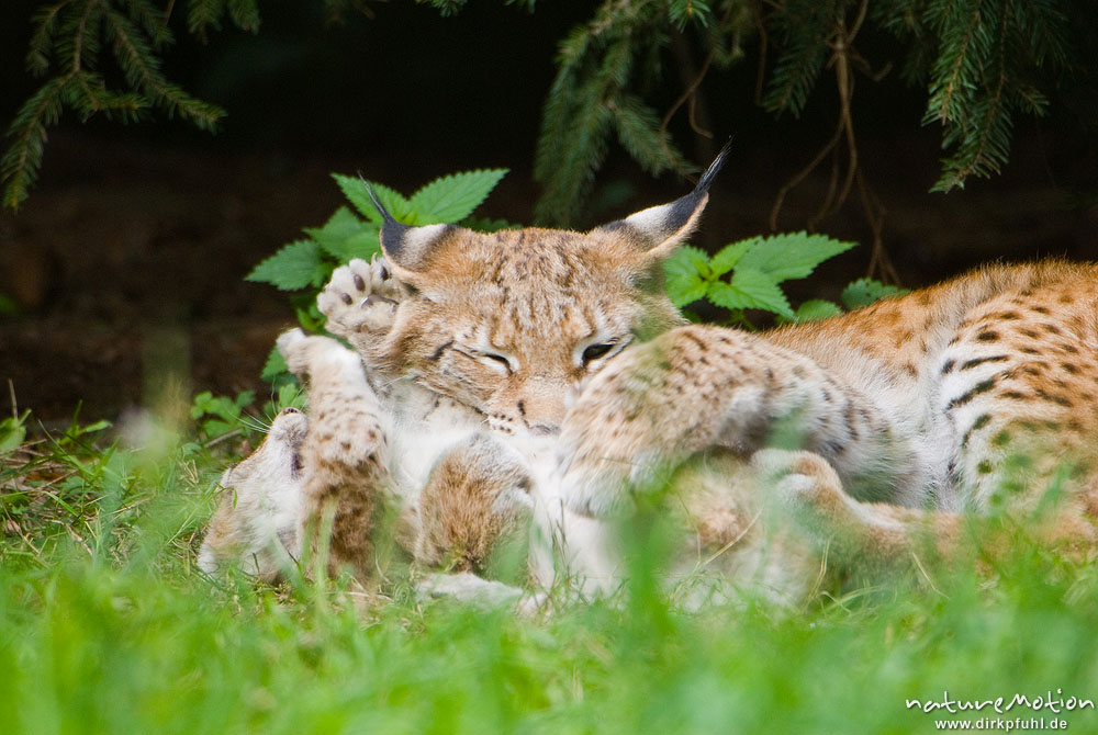Luchs, Lynx lynx, Felidae, Alttier mit Kätzchen, Sozialverhalten, Schmusen, Gehege, Tierpark Sababurg, captive, Sababurg, Deutschland