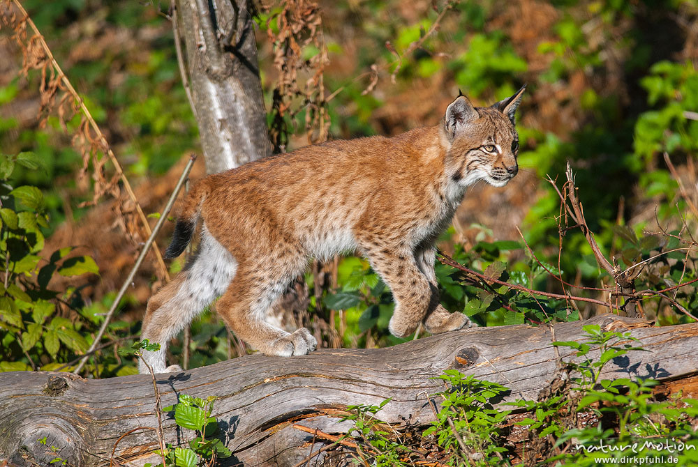 Luchs, Lynx lynx, Felidae, Jungtier auf Baumstamm, Tierpark Neuhaus, captive, Neuhaus, Deutschland