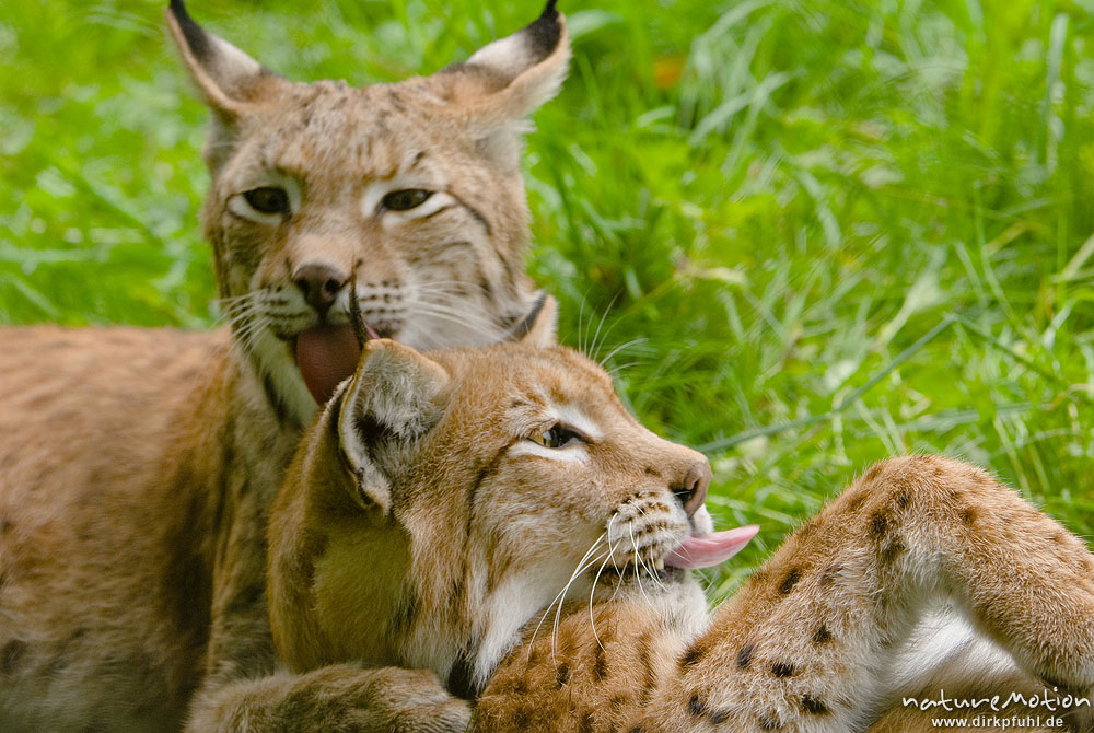 Luchs, Lynx lynx, Felidae, zwei Alttiere beim schmusen, lecken, Sozialverhalten, Schmusen, Gehege, Tierpark Sababurg, captive, Sababurg, Deutschland
