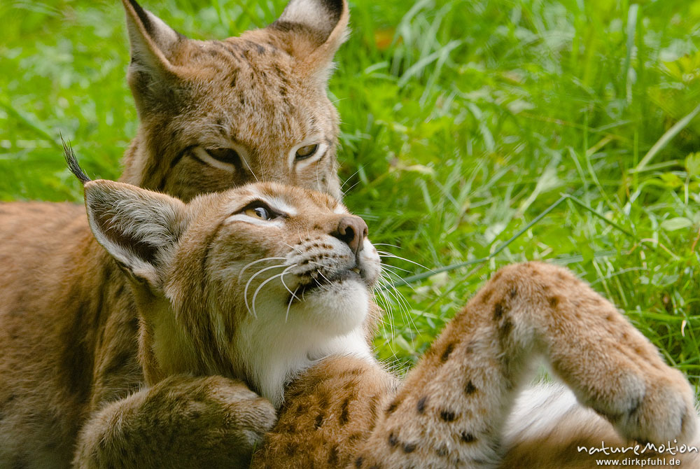 Luchs, Lynx lynx, Felidae, zwei Alttiere beim schmusen, lecken, Sozialverhalten, Schmusen, Gehege, Tierpark Sababurg, captive, Sababurg, Deutschland