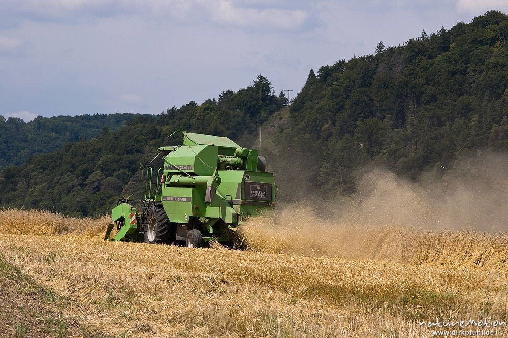 Mähdrescher bei der Getreideernte, älteres Modell mit offenem Fahrstand Altmühltal, Deutschland