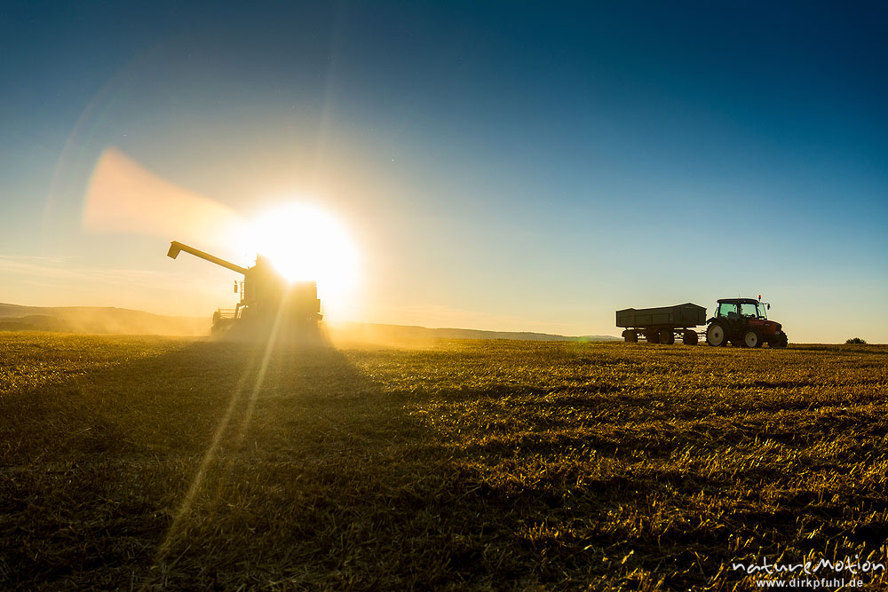 Mähdrescher bei letzten Mäharbeiten im Abendlicht, Leineauen, Göttingen, Deutschland