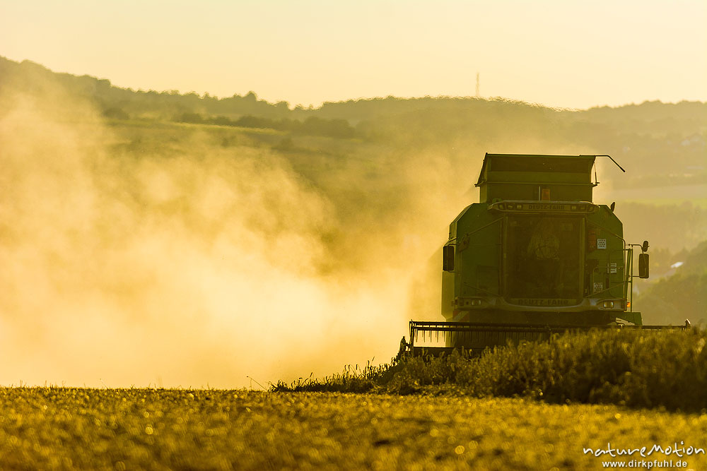 Mähdrescher bei letzten Mäharbeiten im Abendlicht, Leineauen, Göttingen, Deutschland