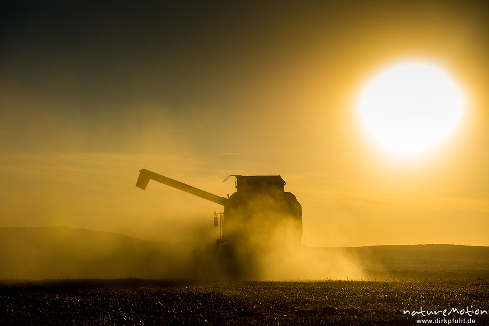 Mähdrescher bei letzten Mäharbeiten im Abendlicht, Leineauen, Göttingen, Deutschland