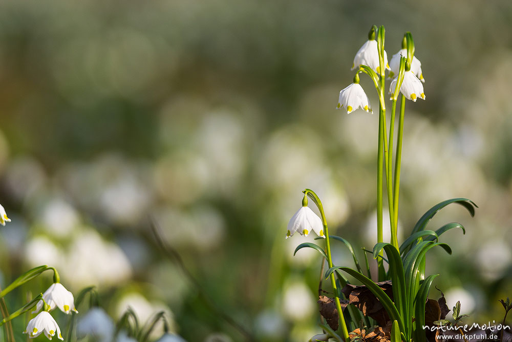 Märzenbecher, Leucojum vernum, Amaryllidaceae, dichter Bestand blühender Pflanzen im Buchenwald, Leinebusch, A nature document - not arranged nor manipulated, Göttingen, Deutschland