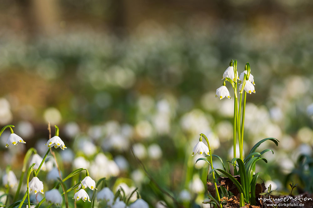 Märzenbecher, Leucojum vernum, Amaryllidaceae, dichter Bestand blühender Pflanzen im Buchenwald, Leinebusch, A nature document - not arranged nor manipulated, Göttingen, Deutschland
