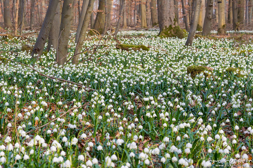 Märzenbecher, Leucojum vernum, Amaryllidaceae, dichter Bestand blühender Pflanzen im Buchenwald, Leinebusch, A nature document - not arranged nor manipulated, Göttingen, Deutschland