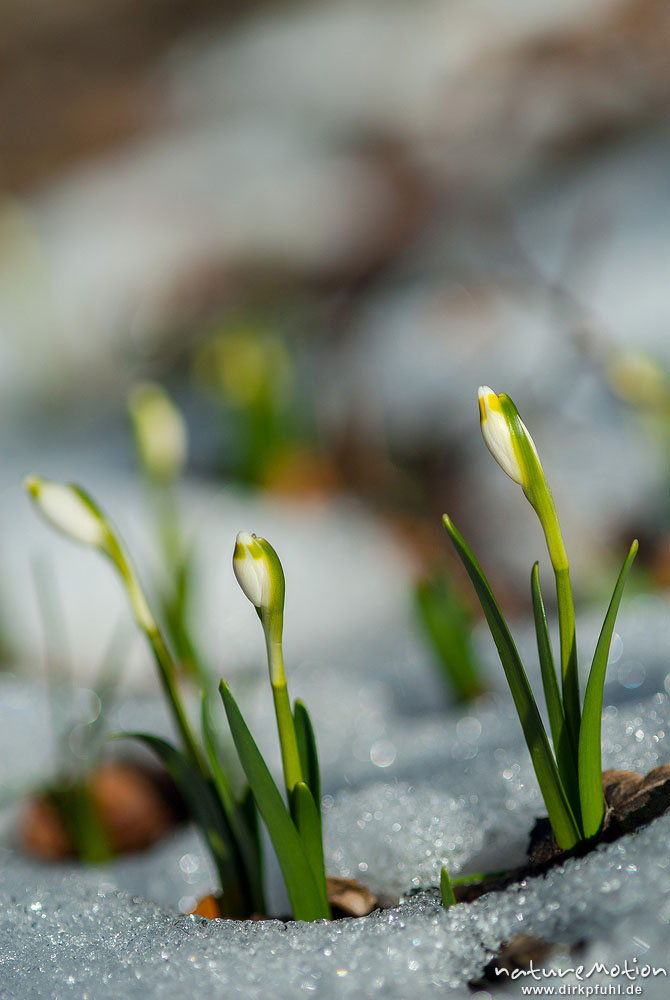 Märzenbecher, Leucojum vernum, Amaryllidaceae, erster Trieb inmitten von Schneeresten, Westerberg, A nature document - not arranged nor manipulated, Göttingen, Deutschland