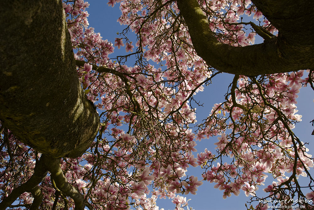 Magnolie, Magnolia spec., Magnoliaceae, blühender Baum am Tor der Kirche von Wahlhausen, Wahlhausen, Deutschland