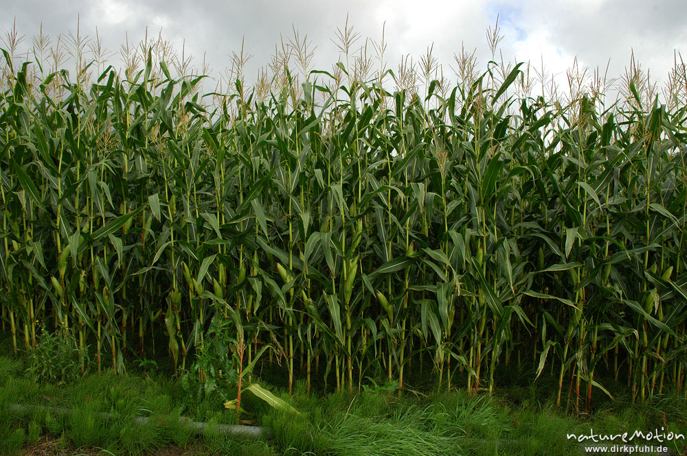 Mais, Zea mais, Pflanzenreihe am Feldrand, Proitzer Mühle Wendland, Deutschland