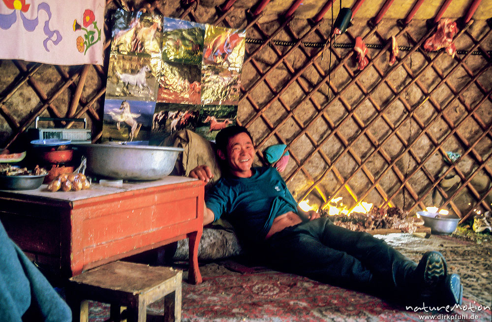 Mann ruht sich in der Jurte aus, Wüste Gobi, Mongolei