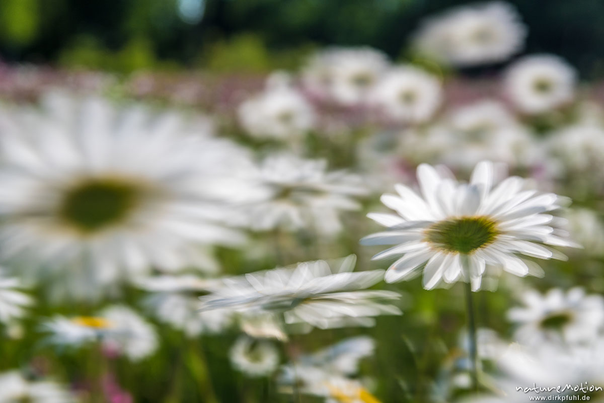 Margerite, Wiesen-Wucherblume, Leucanthemum vulgare, Korbblütler (Asteraceae), Blüten, dichter Bestand, bewegen isch im Wind, verwischt, Kiessee, Göttingen, Deutschland