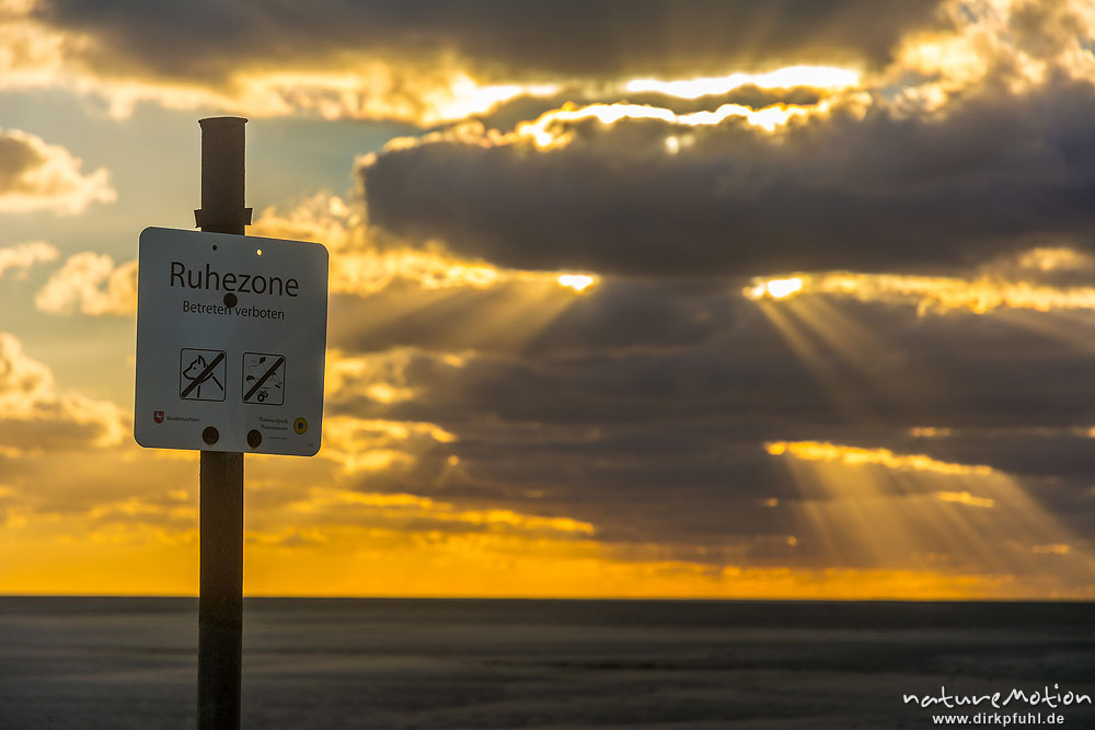 Markierung der Ruhezone Nationalpark, Sonnenuntergang über dem Meer, Hohes Riff, Borkum, Deutschland
