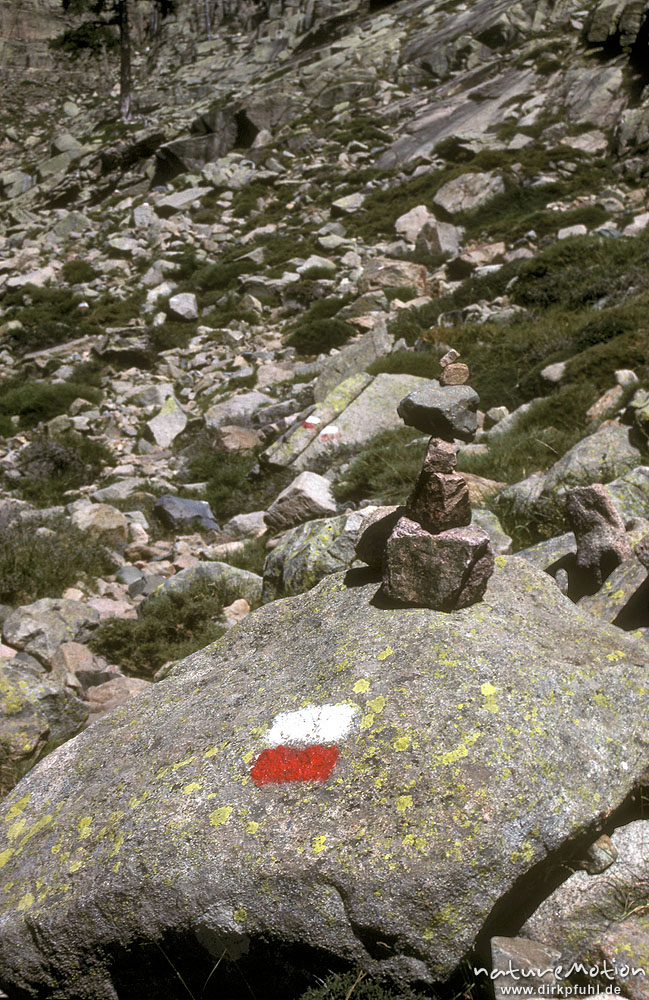 Markierung des Wanderweges GR 20 (weiß-rot), Golo-Tal, Korsika, Frankreich