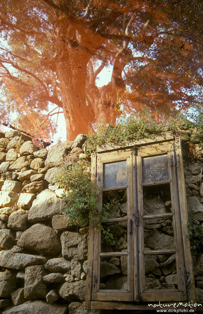 Mauer mit altem Fenster, Olivenernte, Kloster St. Angelo, Balagne, Korsika, Frankreich