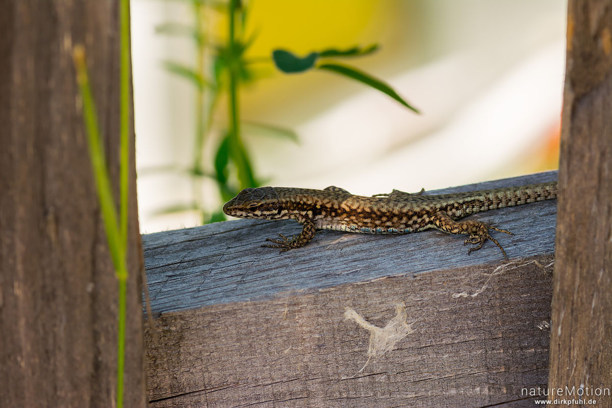 Mauereidechse, Podarcis muralis, 	Echte Eidechsen (Lacertidae), auf Zaun, Camping Seiseralm, A nature document - not arranged nor manipulated, Völs am Schlern, Südtirol, Italien