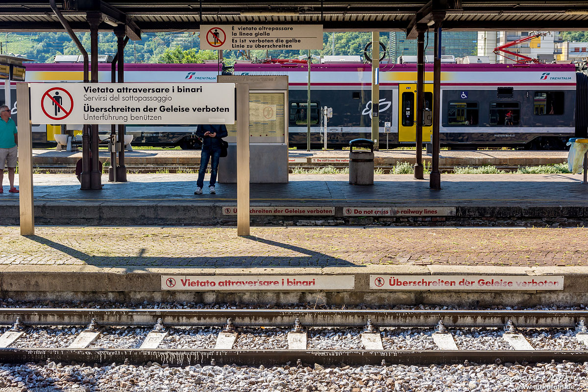 mehrfache Verbotsschilder: "Überschreiten der Gleise verboten / Vietato attraversate i binario", Bahnhof Bozen, Bozen, Italien