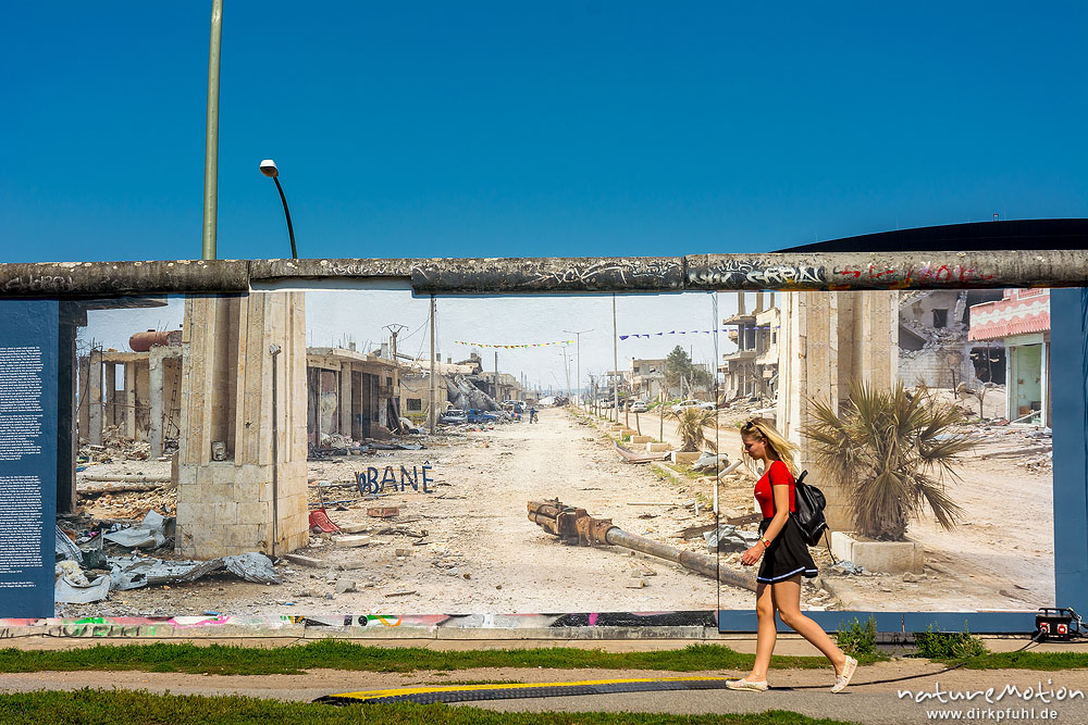 Menschen gehen achtlos an einer Fotoaustellung vorbei. Fotos zeigen Ansichten aus dem zerstörten Syrien, Eatside Gallery, Berlin, Deutschland
