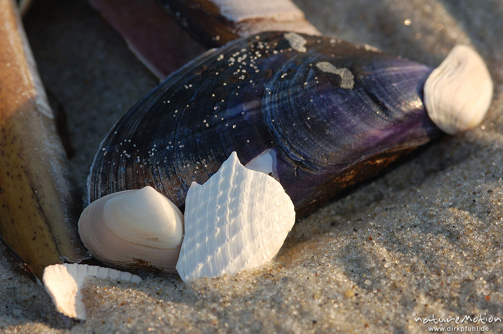 Miesmuschel, Mytilus edulis, Mytilidae, Miesmuschelschale im Sand, Amrum Amrum, Deutschland