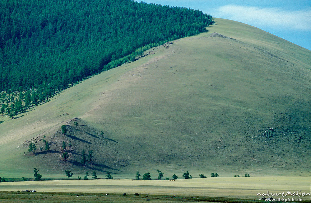 mit Lerchen bewachsener S?dhang eines H?henzuges, typische scharfe Baumgrenze Changai, Mongolei