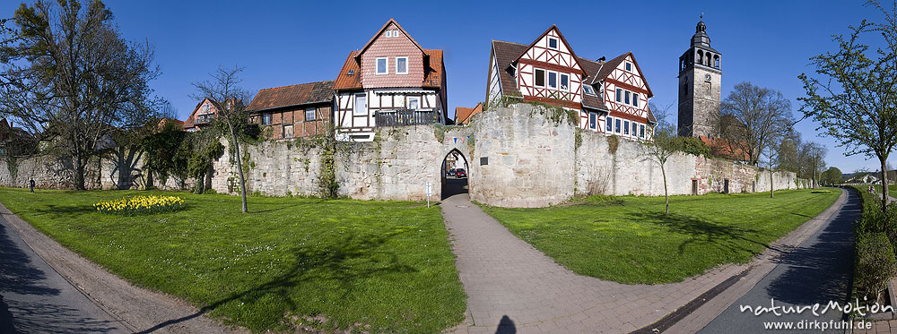 mittelalterliche Stadtmauer mit Tor, Fachwrkhäusern und Kirchturm, davor Parkanlage, Bad Sooden-Allendorf, Deutschland