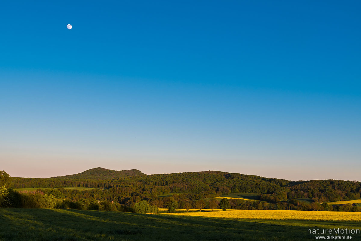 Mond über Wiesen und Rapsfeldern, Blick auf die Gleichen, Diemarden bei Göttingen, Deutschland