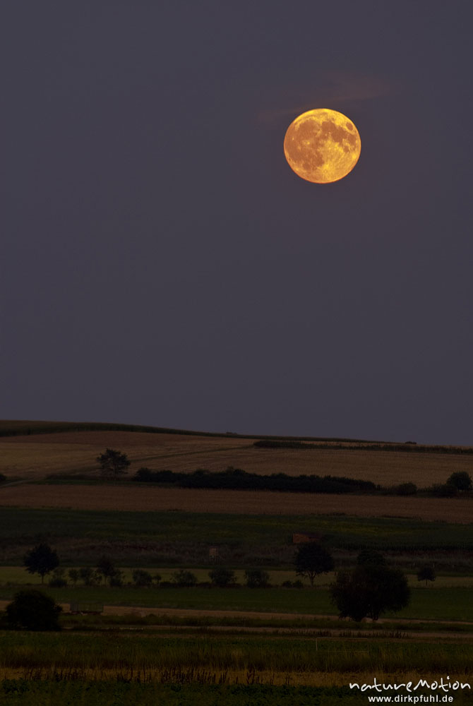 Mond, Vollmond, kupferfarben, kurz nach Mondaufgang über Getreidefelder, Leineauen, Göttingen, Deutschland