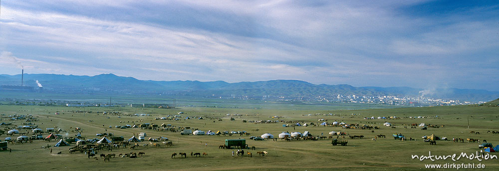 Naadam-Camp südlich von Ullanbaatar: zum Naadam-Fest ziehen die Nomaden aus weitem Umkreis zur Hauptstadt, Zelte, Jurten und Pferdeherden, Ulaanbaatar - Ulan Bator, Mongolei